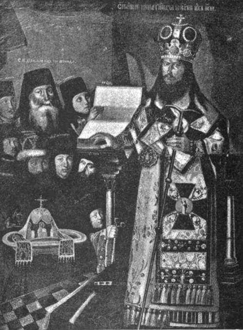 Никогда еще старая Москва не видела у себя такого блестящего собора иерархов как в конце 1666 года. В это время здесь были два восточных патриарха, александрийский Паисий и антиохийский Макарий, десять митрополитов (из них шесть не русских), семь архиепископов, четыре епископа, тридцать архимандритов, кроме игуменов, протопопов и др. духовных лиц. Все они были приглашены на собор царем Алексеем Михайловичем с целью положить конец делу патриарха Никона, который вследствие своей размолвки с государем удалился с патриаршего престола и проживал в своем любимом Воскресенском монастыре. Послано было и к Никону приглашение явиться в Москву на соборный суд. Знал патриарх, что ничего доброго ему нельзя ожидать от этого собора, где одни из иерархов имели личную вражду к нему, другие готовы были действовать против него в угоду царю и боярам. Получив приглашение явиться в Москву на суд, он совершил таинство елеосвящения, помазав освященным елеем себя, весь причт и братию, а на другой день отслужил литургию266, в конце которой сказал братии поучение о перенесении скорбей. Прощаясь с братией, патриарх как бы знал, что ему не суждено вернуться живым в любимую обитель. Мог ли он предчувствовать, что через пятнадцать лет он вернется сюда уже бездыханным телом и будет погребен в той самой церкви, где он совершал теперь свою последнюю литургию?