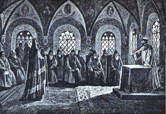 Рис. 18. Суд над патриархом Никоном. Рисунок Земцова (из журнала „Нива» за 1892 г.).