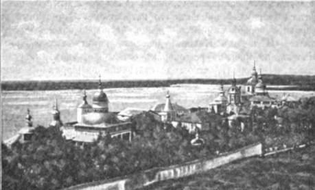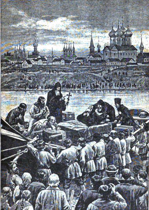Следующий ночлег пришлось сделать в Мологе, которая была тогда слободою. Близ Мологи находился принадлежавший патриарху Афанасиевский монастырь. Всего удобнее было бы остановиться на ночлег в монастыре, но пристав не согласился на это и велел ночевать в слободе. Когда утром следующего дня Никона повезли мимо самых ворот монастыря, и все монахи вышли ему на встречу во главе с строителем Сергием, учеником Никона, то полковник без церемонии разогнал всех «с великим прещением и яростию».