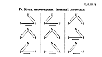 Вот 3 главных (основных) типа взглядов на происхождение культуры. В деятельности человека, гражданственного общественного животного, мы можем различать три стороны: мировоззрение, экономику и культ. Первое есть совокупность понятий о мире, нравственности, праве и т. д.; оно есть мифология, догматика, наука. Эту совокупность понятий, notiones, обозначим через N. Второе – совокупность орудий производства, instrumentas – обозначено через I. Последнее – совокупность святынь, реликвий, церемоний, таинств etc., sacra. Обозначим через S. Это основные направления, – следовательно), мыслимы 3 основные теории взаимоотношения I, S, N – смотря по тому, что именно считаем мы за основной момент и какие два, посредственно один чрез другого или оба непосредственно из основного, считаем производными. – «Естественнее всего» считать в основе лежащей систему понятий; получается идеологизм, мировоззрение идеологов. Затем можно положить в основу орудия производства, экономику: получается экономический материализм. Наконец, новейшая точка зрения, развиваемая по преим(уществу) английской школой фольклористов959 – полагает в основу культ. Получается «религиозный материализм», религиозный реализм.