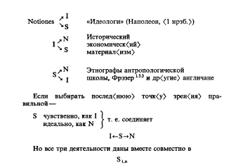 Выбор той или другой вершины за основную характеризует собою тип теории (один из трех), а выбор путей соединения этой вершины с двумя другими – ее видоизменение, ее модус. Так, полагая в основу S, мы имеем теории 3-го типа. S можно соединить с другими вершинами тремя способами: либо путем SI+SN; либо путем SIN; либо путем SNI. В первом случае мы отрицаем прямую связь между I и N, в двух других – утверждаем, и притом, в смыслах прямо противоположных. Итак, с каждой вершиной получится: