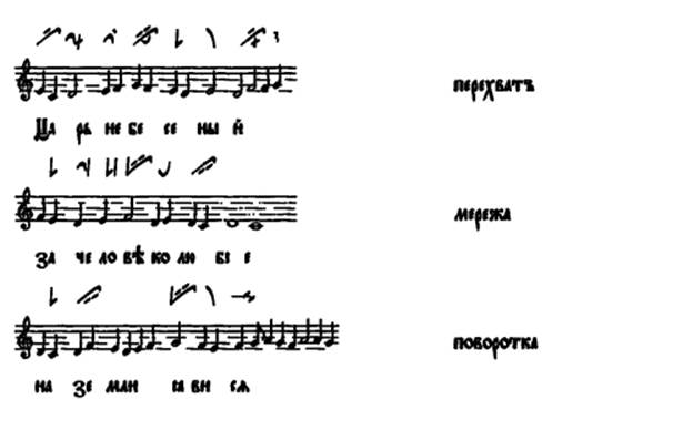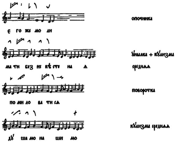 | Киноварные пометы | Дополнительные значки при знаменах в безлинейной нота ции, писанные киноварью (красной краской) и указывакмцие либо на относительную высоту звука (степенные пометы) либо на характер или способ исполнения отдельных знамен (указательные пометы). | 2 | 3 |