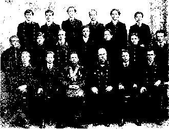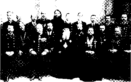 Рисунок 52. Корпорация семинарии в 1915 году. Сидят слеза направо: Н. П. Громов, прот. Суперанский, инспектор В. И. Лебедев, А. К. Бурцев, епископ Никанор, А. С. Рубинов, ректор прот. Н. К. Чуков, прот. П. Д. Метелев, Я. С. Елпидинский. Стоят слева направо: И. П. Бухта, М. П. Афанасьев, П. М. Осиев, Н. С. Стручков, В. Федоров, А. П. Боголепов, С. А. Олесевич, В. И. Фарсинонов, И. И. Поспелов, М. П. Смирнов