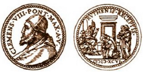Медаль «На присоединение русинов», изготовленная в Ватикане в честь Брестской унии 1596 г.: изображены папа Климент VIII и сцена приема понтификом Ипатия Потия и Кирилла Терлецкого