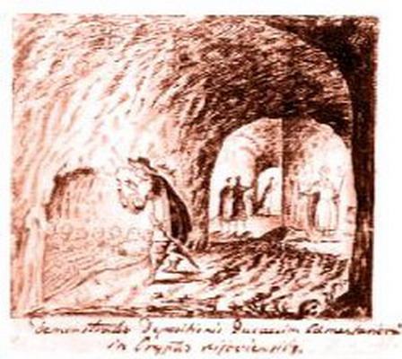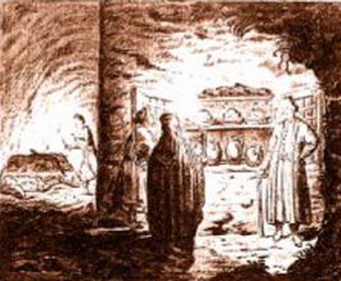 В пещерах Киево-Печерской Лавры. Мироточивые главы. Рис. Абрахама ван Вестерфельда, 1651 г.
