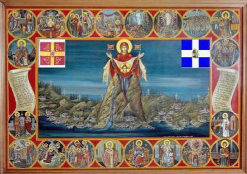 Икона Божией Матери «Игумения Святой Горы Афон» с картой афонских монастырей