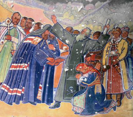 Проповедь Иоанна Вишенского (роспись из монастыря Рождества Христова в Жовкве Львовской области). Худ. Юлиан Буцманюк, 1930-е гг. Рядом с Иоанном Вишенским Б. Хмельницкий, И. Мазепа, Г. Гулевичивна и другие православные деятели Украины