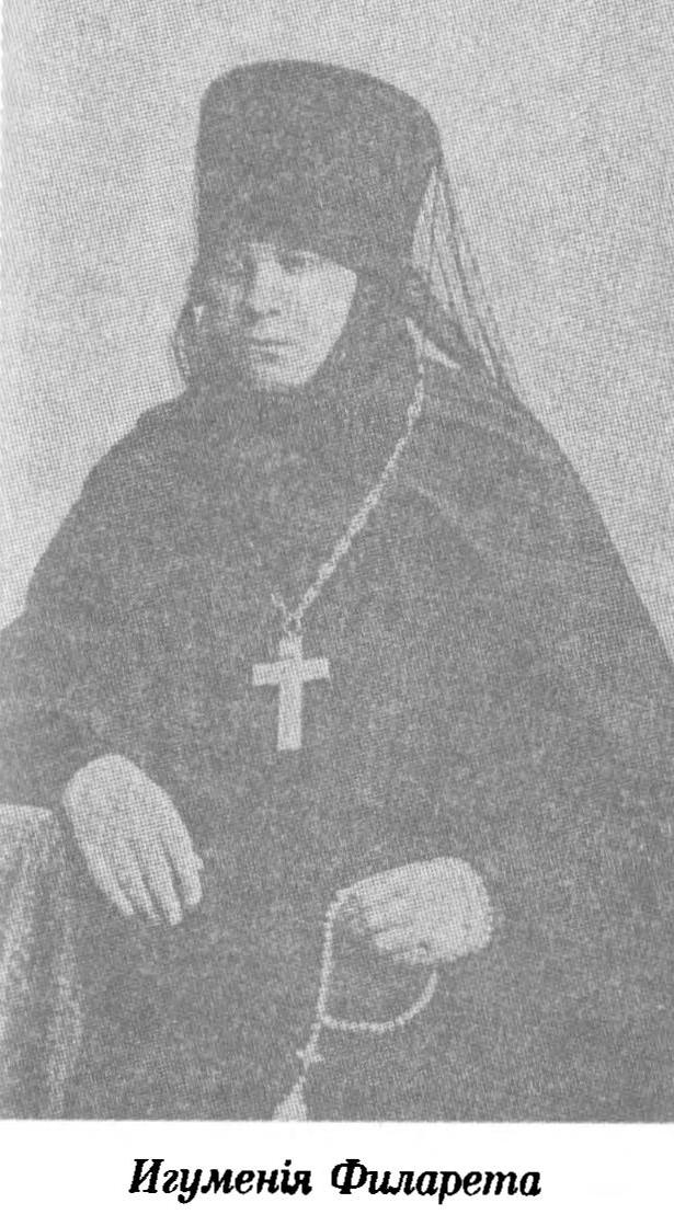 Когда игуменья Евгения, вследствие своего болезненного состояния, устранилась от управления монастырем, и монахиня Филарета, как ближайшая его сотрудница, заняла ее место, физические труды уже не обременяли ее, но зато тяжким бременем легли на нее труды нравственные по управлению обителью. И сколько забот, хлопот и огорчений выпало на ее долю! Количество сестер все умножалось, расходы по содержанию их и монастыря все увеличивались. Нужно было изыскивать средства и на пропитание этих 350 монастырских жилиц, и поддерживать в приличном виде храмы, кельи и другие монастырские здания. Если требования заботы о материальном, экономическом состоянии обители, то еще больших забот и попечений требовало нравственное, душевное состояние насельниц обители. Нужно было каждой из них дать дело, чтобы никто из них не жил праздно, чтобы все они были полезны себе и обители; нужно было следить за точным исполнением иноческого устава; нужно было принять меры и против искушений и падений, которые везде возможны и всегда были. Такие разнообразные, трудные обязанности, принятые инокинею Филаретой по званию игуменьи, особенно при существовании долголетнего тяжкого недуга, осложнявшегося в старости другими немощами, все более и более расшатывали подорванное здоровье и, наконец, свели в могилу. Прикованная к болезненному ложу, усопшая, как истинная инокиня, прямо смотрела в глаза смерти и постоянно готовилась к ней. Многократно, в течение своей болезни, приобщалась она Св. Таин Тела и Крови Христовых, освятилась таинством св. Елеосвящения и мирно и тихо предала дух свой Господу.
