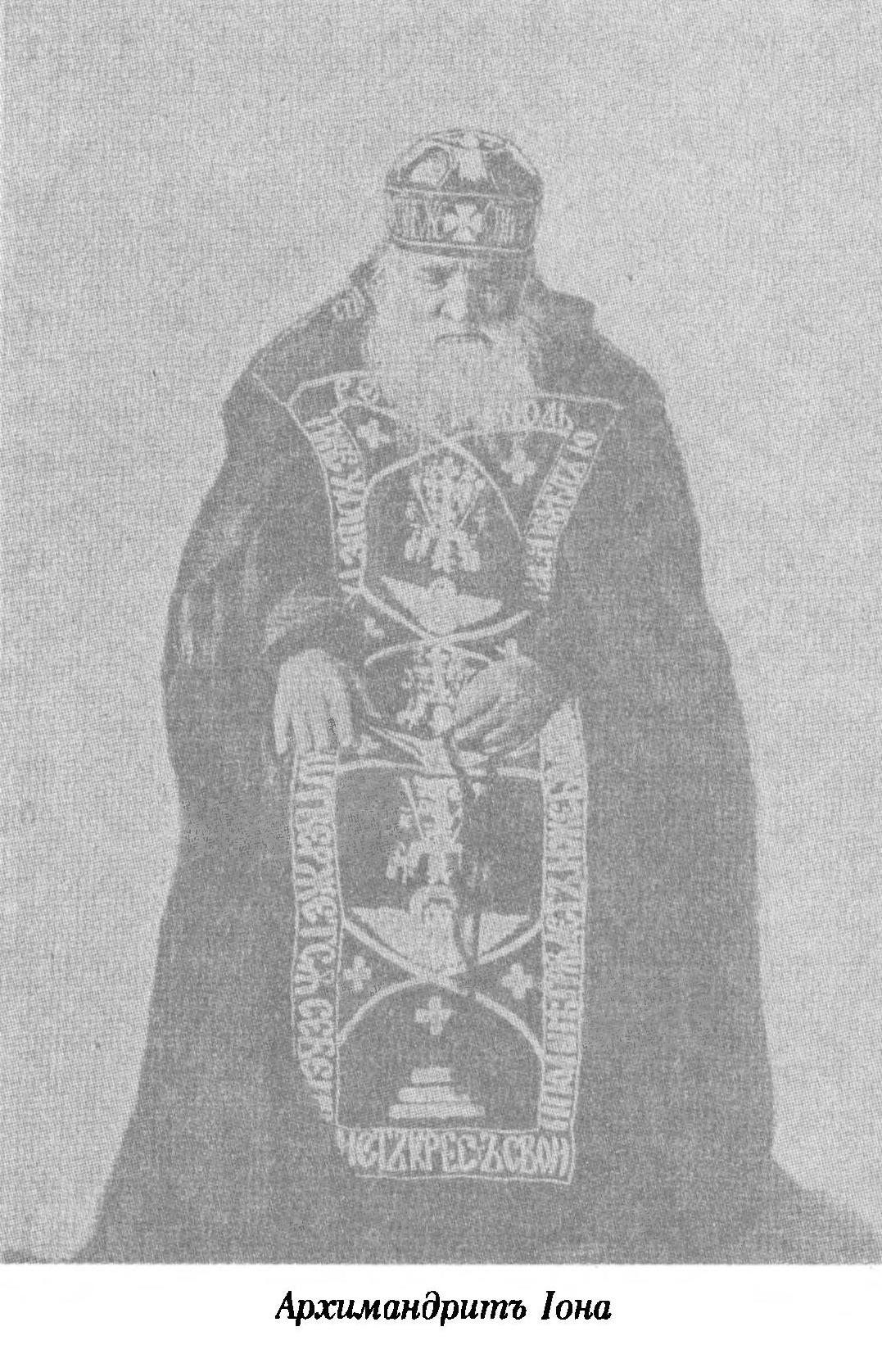 Архимандрит Иона, в схимонасех Петр, основатель и благоустроитель Киевского Свято-Троицкого монастыря, бывший настоятель его, происходил из мещан посада Крюкова Полтавской губернии. Время рождения его с точностью неизвестно, день ангела 22-го сентября. Несомненно, что старец почил в глубокой старости, около 100 лет. В раннем возрасте почивший оставил родительский кров и удалился в Саровскую обитель, где в течение нескольких лет оставался в качестве келейника и послушника у преподобного Серафима Саровского. Окрепнув духом, под руководством строго подвижника, и утвердившись в решении отречься от мира, Иоанн Мирошниченко (мирское имя и звание почившего) в 1836 году уволился из мещанского общества и поступил в Брянскую Белобережскую пустынь (Орловской губернии) послушником, где оставался около 15 лет и где удостоился пострижения в монашество (1843 г. 19 декабря) и рукоположения во иеродиаконы (1845 г. 26 июля).