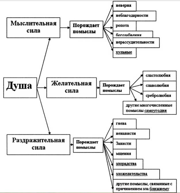 О злых помыслах человека преподобный Никодим Святогорец пишет: «Три у нас в душе силы: мысленная, желательная и раздражительная. От эти трёх сил, по причине повреждения их, рождаются и троякого рода неправильные помыслы» (См. Схему)97.
