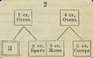 2. Двухродное свойство образуется от соединения двух родов посредством брачных сопряжений, иначе сказать: сближение двух родов производят муж и жена. При счислении степеней в двухродном свойстве и следует прежде всего найти тех супругов, которые сближают род жениха с родом невесты.