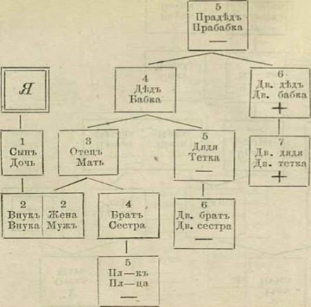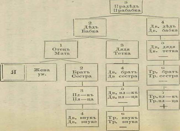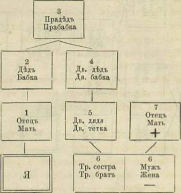 4. Везде мы ограничились только действительным родством, не доводя оного далее 7 степеней. Например, в таблице родства между женихом и родственниками жены его дяди или мужа его тетки (см. эту таблицу под цифрою 11) нет ни двоюродных племянника и племянницы, ни двоюродных правнука и правнуки, которые составили бы по отношению к жениху 8-ю степень. Но и из суммы действительных родственников мы исключили тех, которые в данном случае ни сами не принадлежат к категории лиц, с которыми браки возможны, ни составляют каких-либо посредствующих степеней в происхождении этих лиц. Так, наприм., в 1-й таблице, показывающей родство между женихом (вдовым) и родственниками его умершей жены, не поставлено имен ни пасынка или падчерицы жениха, ни детей, ни внуков их, так как браки с этими и происходящими от них лицами невозможны.