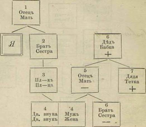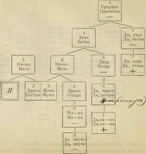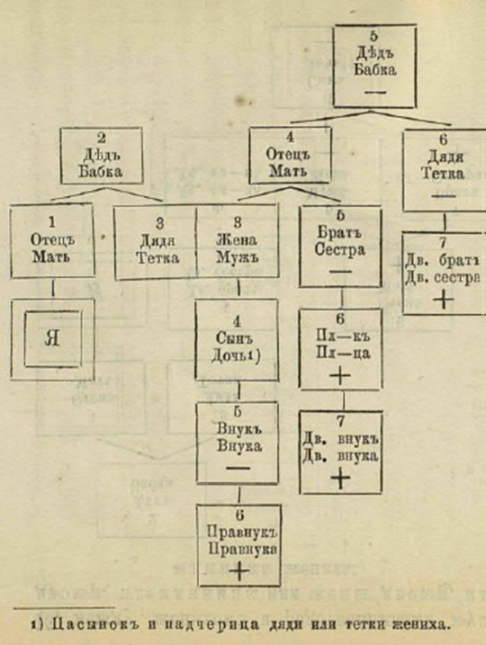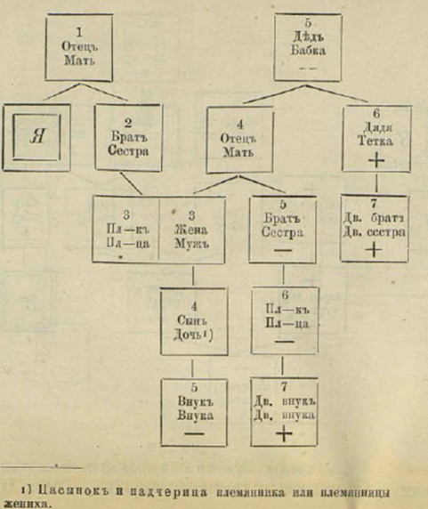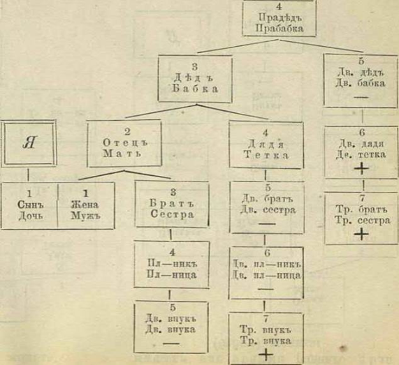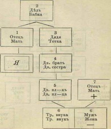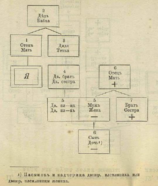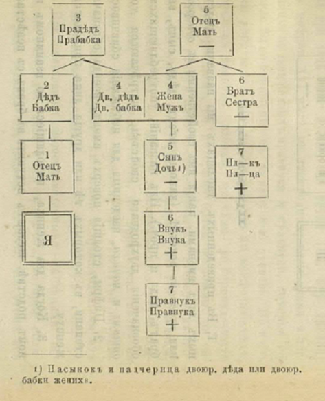 Здесь принимается во внимание такое смешение родственных имен и отношений, чрез которое старшие родственники нисходят на место младших, или входят в родственное подчинение младшим; или из родства кровного – ближайшего переходят в родство дальнейшее – двухродное, как это видно из представленных нами случаев такого смешения родственных лиц. В седьмой и дальнейших степенях хотя также возможно смешение родства, но там оно уже не имеет значения.