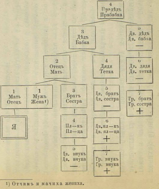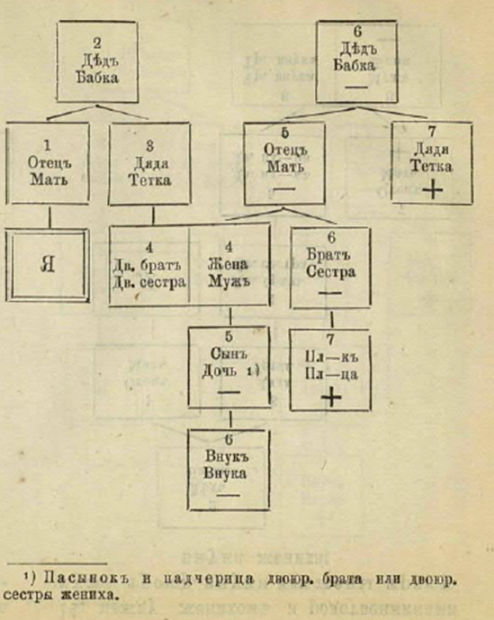 1. В приведенных таблицах мы назвали родственных лиц именами, какие им свойственны в однородном или кровном родстве (каковы: отец, дед, сын, внук, брат, дядя и проч.). Из названий, употребляющихся для обозначения двухродного свойства, встречаются только отчим и мачеха, введенные для избежания сбивчивости.