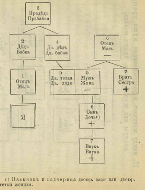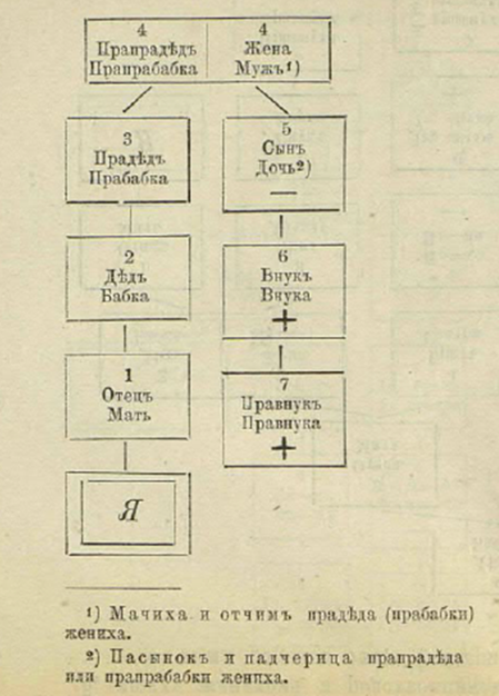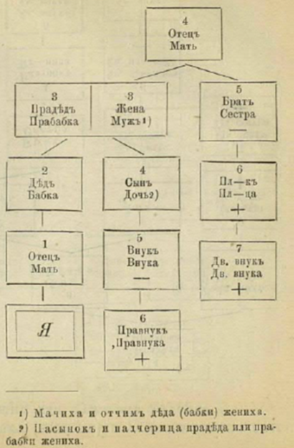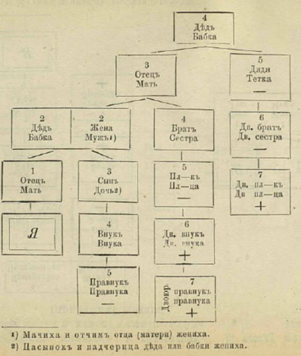 Жених может избрать невесту из фамилии или своей (умершей) жены или жены своего (кровного) родственника или же мужа своей (кровной) родственницы. В первом случае сам жених роднит себя с родом невесты (табл. 1); во втором и третьем случаях лицами, роднящими жениха с невестою бывают: отец с женою – мачехою жениха или мать с мужем – отчимом жениха (табл. 2), дед с женою – мачехою отца (матери) жениха или бабка с мужем – отчимом отца (матери) жениха (табл. 3), прадед с женою – мачехою деда (бабки) жениха или прабабка с мужем – отчимом деда (бабки) жениха (табл. 4), прапрадед с женою – мачехою прадеда (прабабки) жениха или прапрабабка с мужем – отчимом прадеда (прабабки) жениха (табл. 5), сын с женою или дочь с мужем (табл. 6), внук с женою пли внука с мужем (табл. 7), брат с женою или сестра с мужем (табл. 8), племянник с женою или племянница с мужем (табл. 9), двоюр. внук с женою или двоюр. внука с мужем (табл. 10), дядя с женою или тетка с мужем (табл. 11), двоюр. брат с женою или двоюр. сестра с мужем (табл. 12), двоюр. племянник с женою или двоюр. племянница с мужем (табл. 13), троюрод. внук с женою или троюр. внука с мужем (табл. 14), двоюр. дед с женою или двоюр. бабка с мужем (табл. 15), двоюр. дядя с женою или двоюр. тетка с мужем (табл. 16).