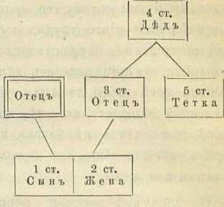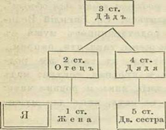 Существует, впрочем, довольно распространенное мнение, будто бы мужа и жену следует считать за одно лицо только в отношении о исходящему от них потомству, родственники же с той и другой стороны должны быт полагаемы в разных степенях24. «Так как – говорят – муж и жена, составляя одно для нисходящего от них потомства, не превращают, однако ж, двух родов в один, то и супруги в отношении к родственникам с той и другой стороны должны быт полагаемы в разных степенях». Таким образом, мнение это вводит раздельную степень между мужем и женою в отношении к родственникам того и другой; так что кровные родственники жены по отношению к ее мужу признаются находящимися не в тех же самых степенях, в которых стоят они к жене, а на одну степень далее и наоборот. Иначе сказать: родственники в двухродном свойстве определяются не теми степенями, в которых считаются соответствующие им кровные родственники, а на одну степень дальше последних. Поэтому, наприм., тестя следует считать не в первой степени в отношении к зятю, как родного отца, а во второй, сестру жены – не во второй степени, как родную сестру, а в третьей, жену двоюр. брата – не в четвертой степени, как самого двоюродн. брата (или сестру), а в пятой и т. д.