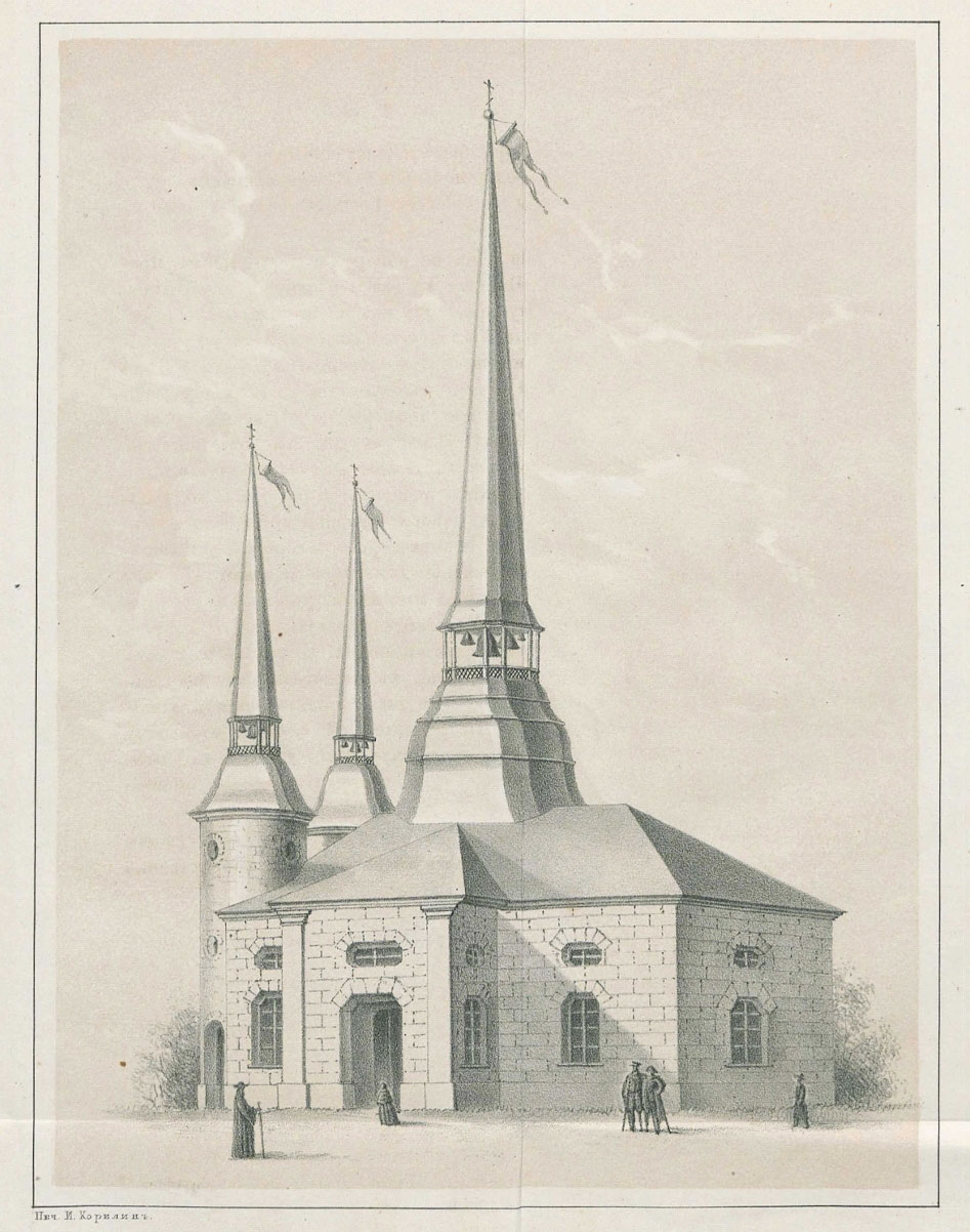 По словам Описания С.-Петербурга Богданова и Рубана4, она была «видом крестообразна, о трех шпицах», из которых средний превышал два остальные и имел вид башни в голландском вкусе, особенно любимом ПЕТРОМ. На этой башне находился небольшой позолоченный купол и висели колокола, отбивавшие часы.