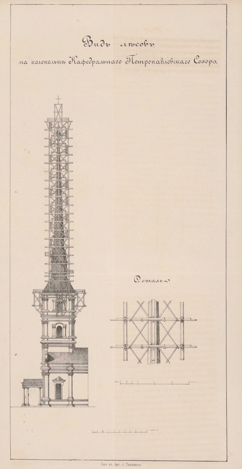 Для производства необходимых капитальных исправлений в шпиле и кресте, единственным надежным средством признано было устройство таких лесов, которые бы обнимали верхнюю деревянную, покрытую золочеными листами часть колокольни так, чтобы легко было осматривать ее по всему протяжению, и притом нигде не касались до деревянной части шпиля, потому что на прочность его очевидно уже нельзя было надеяться, а следовательно нельзя было обременять его частью груза лесов и подвергать сотрясениям, неизбежным во время постройки.