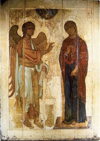 «Благовещение» (ГТГ) (илл. 100) – наиболее ранняя из русских икон XII в., созданная около 1130 г. в позднесредневековой традиции происхождение этой иконы ошибочно было связано с Устюгом и за ней закрепилось название «Устюжского Благовещения», которое иногда употребляется и сейчас. Тем не менее, документально известно, что она происходит из Георгиевского собора Юрьева монастыря, хотя не исключено, что этот образ мог быть связан с церковью Благовещения на Городище, возведенной в 1103 г. и находящейся на противоположном берегу Волхова напротив Юрьева монастыря. Предназначавшаяся для украшения одного из главных княжеских храмов Новгорода, икона, несомненно, создавалась по княжескому заказу одним из лучших художников, бывших в распоряжении новгородского князя. Вместе с другими почитаемыми новгородскими святынями, она была вывезена по приказу Ивана Грозного и долгое время служила храмовым образом Благовещенского собора Московского Кремля. Будучи там одной из самых почитаемых икон, она неоднократно поновлялась, ее фон полностью заменен, крылья и ступни ног архангела написаны заново.