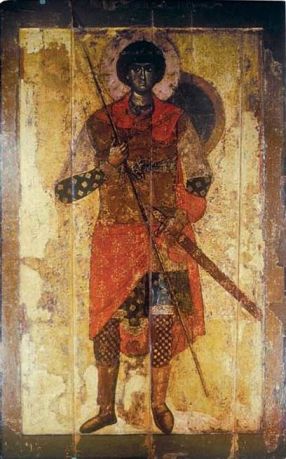 Еще одной иконой из Георгиевского собора Юрьева монастыря является храмовый образ св. Георгия (ГТГ), созданный, вероятнее всего, к моменту освящения храма в 1130 г. (илл. 101) Внушительные размеры иконной доски, как и в случае с «Благовещением», указывают на то, что икона была выполнена в самом Новгороде, возможно, теми же мастерами, которые расписывали собор, на что, в частности, указывает сходство орнаментальных мотивов. Св. Георгий представлен в рост, в торжественной фронтальной позе и в полном воинском облачении. Икона неоднократно поновлялась: так, в XIV в. у нее был заново написан лик (поверх остатков первоначальной живописи), а на самой фигуре прослеживается множество разновременных вставок, которые вносят известную дробность в восприятие образа. Тем не менее, облик святого сохранил свою выразительность. Его могучая фигура имеет округлые, обобщенные очертания, а весь образ, несмотря на детализированное изображение доспехов, декоративных элементов облачения, тонких золоченых орнаментов одежд, смотрится цельно и монолитно. Устойчивая постановка фигуры св. воина, уверенная решительность его позы, говорят о твердости духа и непоколебимости веры, защитником и стражем которой он здесь представлен.