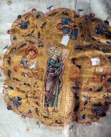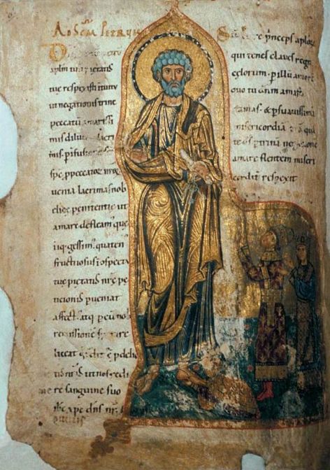 76. Апостол Петр с предстоящими князем Ярополком, его женой Ириной и коленопреклоненной княгиней Гертрудой. Миниатюра Молитвенника Гертруды. 1078–1086 гг. Чивидале, Национальный археологический музей, cod. CXXXVI
