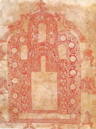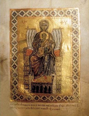 80. Богоматерь на престоле. Миниатюра Молитвенника Гертруды. 1078–1086 гг. Чивидале, Национальный археологический музей, cod. CXXXVI