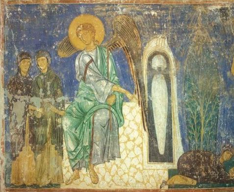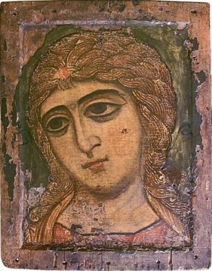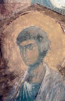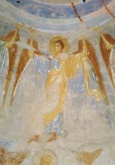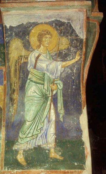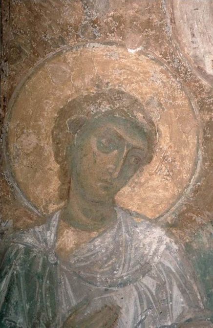 91. Архангел из «Благовещения». Фреска северного предалтарного столба собора Рождества Богородицы Антониева монастыря в Новгороде. 1125 г.