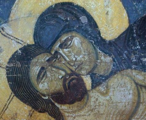 Таким образом, жертвенный символизм этого сюжета выражен здесь со всей определенностью. Подобная интерпретация «Сретения» появляется в византийской иконографии лишь в самом конце XII в., и пример Кирилловской церкви оказывается едва ли не самым древним из известных памятников. Ближайшей параллелью этой фреске является аналогично расположенное «Сретение» в соборе Евфросиниева монастыря, к сожалению, в настоящий момент еще практически полностью закрытое поздними записями.