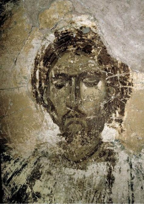 97. Лик неизвестного святого. Фрагмент фрески из основного объема Георгиевского собора Юрьева монастыря в Новгороде. Около 1130 г.