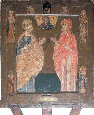 С Новгородом, скорее всего, связана и небольшая икона «Богоматерь с Младенцем» (илл. 195), находящаяся в Успенском соборе Московского Кремля, куда она попала, вероятно, также в XVI в., во времена Ивана Грозного. иконография имеет редкие особенности: она сочетает признаки двух разных иконографических типов: изображено ласкание Младенца, к Чьей щечке Богоматерь прикасается щекой, как в типе Гликофилусы (Умиления), но Христос не обнимает Мать за шею, а держит свиток своего учения, что характерно для типологии Одигитрии. На голове Богоматери, кроме голубого мафория, – второй плат, пурпурно-коричневый с золотыми узорами. Придерживая край мафория, Богоматерь словно защищает Младенца с его помощью, и в этом жесте нельзя не видеть отражения константинопольского культа Ризы Богоматери.