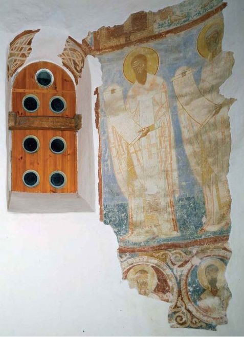 Кафедральный Софийский собор Новгорода, возведенный в 1045–1050 гг. и долго остававшийся единственной каменной церковью города, стоял нерасписанным более чем полстолетия. Его интерьер был украшен лишь иконами и единичными стенописными изображениями иконного типа, от которых на южной паперти собора сохранилась композиция «Св. Константин и Елена» (илл. 81). Равноапостольный император и его мать изображены по сторонам обретенного ими Св. Креста. исполненная «аль секко», то есть по сухой штукатурке, живопись отличается графичностью: поверх локальных раскрасок выполнен очень уверенный контурный рисунок, а проработка полутонами практически отсутствует. Такая манера письма, напоминающая произведения книжной миниатюры, не находит прямых аналогий ни в древнерусской, ни, более широко, в византийской монументальной живописи, что породило множество различных мнений о происхождении и о времени создания этого изображения. Между тем, типично комниновский тип ликов Константина и особенно Елены, четкость и изысканность рисунка, указывают на то, что данное произведение никак не может быть выведено за пределы культуры византийского мира. Композиция была создана после того, как галереи Софии, изначально открытые, были перекрыты сводами и превращены в закрытые паперти. Следовательно, ее можно датировать последней четвертью XI в., то есть периодом, когда в Новгороде еще не было профессиональных художников-монументалистов, а работала, видимо, группа иконописцев, один из которых, не владея техникой фрески, написал «Св. Константина и Елену», применив знакомую ему иконную технологию к стенописи.