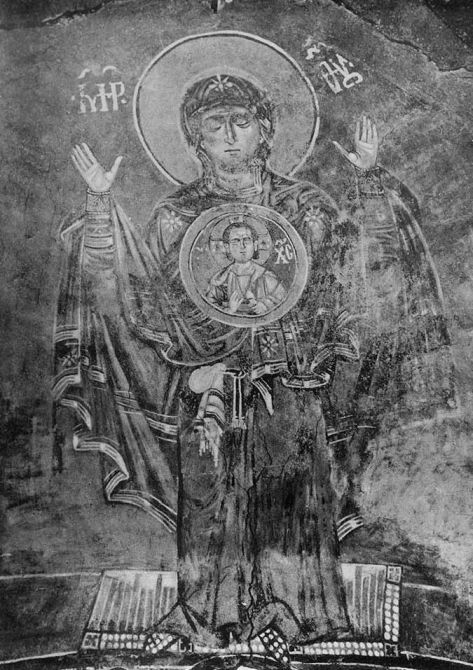 92. Богоматерь из «Благовещения». Фреска южного предалтарного столба собора Рождества Богородицы Антониева монастыря в Новгороде. 1125 г.