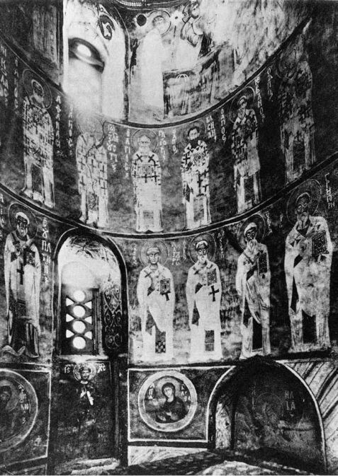 Программа росписи Софии поддается лишь самой приблизительной реконструкции, но об отдельных ее звеньях все же можно составить представление. Так, мощную фигуру Пантократора, судя по зарисовкам В.В. Суслова, выполненным в конце XIX в., окружали фигуры четырех архангелов и четырех херувимов, что представляет собой редкий для Византии пример купольной декорации, ориентированный на образцы Македонской эпохи IX–X вв., когда росписи куполов еще буквально иллюстрировали пророческие видения Вседержителя в окружении небесных сил. Примечательно, что именно эта купольная композиция будет повторена в целом ряде новгородских памятников XIV столетия, явно ориентированных на росписи Софийского собора. Важнейшим элементом росписи Софии являлся также расширенный святительский чин, располагавшийся, вероятнее всего, в два регистра и достигавший просветных арок, где сохранились фигуры четырех святителей (Поликарп Смирнский, Карп Фиатирский, Анатолий и Герман Константинопольские) (илл. 82). Подобный двухъярусный чин святителей отныне станет обязательным элементом новгородских храмов XII века.