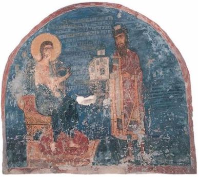 154. Князь Ярослав Владимирович подносит модель храма Вседержителю. Фреска церкви Спаса на Нередице близ Новгорода. 1199 г. Копия Л.А.Дурново. ГРМ