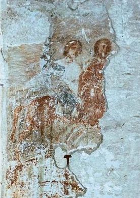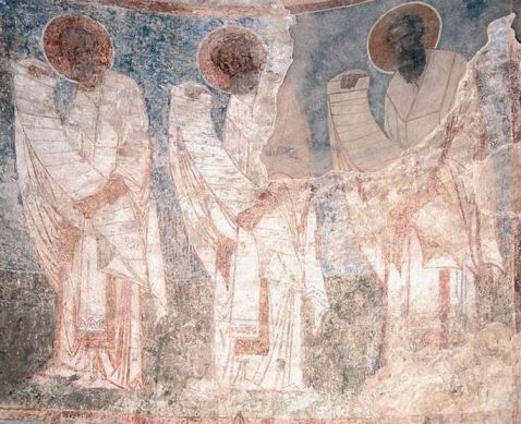 93. Волхвы из «Рождества Христова». Фреска южной стены собора Рождества Богородицы Антониева монастыря в Новгороде. 1125 г.