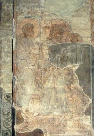 Фресковые ансамбли новгородских храмов первой трети XII в. сохранились лишь частично. Кроме росписи Софийского собора, была исполнена декорация церкви Благовещения на Городище, где находилась резиденция новгородского князя. Сам храм был полностью перестроен в XIV в., но археологические исследования выявили остатки древней постройки, в развалах которой были обнаружены многочисленные фрагменты фресок XII в., чрезвычайно близких стенописи Софии. Можно предполагать, что одна и та же артель художников украсила, в неизвестной нам последовательности, Благовещенскую церковь и Софийский собор, а затем, за два-три сезона, расписала Николо-Дворищенский собор, только что выстроенный новгородским князем Мстиславом Владимировичем, сыном легендарного Владимира Мономаха – последнего киевского князя, объединявшего под своей властью всю Русь.