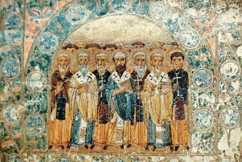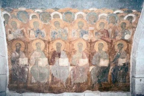 98. Чин преподобных. Фреска купола северо-западной башни Георгиевского собора Юрьева монастыря в Новгороде. Около 1130 г.