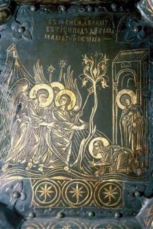 Западные врата посвящены евангельскому циклу (илл. 187), который дополнен несколькими сюжетами, раскрывающими историю главных богородичных реликвий – гроба Богоматери, Ее пояса и покрова, хранившихся во Влахернском и Халкопратийском храмах Константинополя. Здесь присутствуют такие редкие сюжеты, как «Несение одра Богоматери» (илл. 188), «Положение пояса Богоматери», а также впервые изображен «Покров Богоматери» (илл. 189), который станет одним из важнейших богородичных праздников Русской Церкви. По своему иконографическому составу эти сюжеты, вероятно, восходят к росписям Мономахова собора, которые, как говорилось в начале этой главы, повторяли систему декорации Успенского собора Киево-Печерской Лавры. Южные врата представляют собой уникальный по широте состава цикл деяний архангела Михаила, культ которого был особенно распространен в княжеской среде (илл. 190). Клейма врат выполнены в графичной манере, что предопределено самой техникой золотой наводки однако в изображениях угадываются многие художественные тенденции, определявшие стилистику византийской живописи позднего XII столетия. Лики персонажей отличаются острой индивидуальностью и порой даже гротескностью, что сближает памятник с некоторыми фресками маньеристического направления (фрески церкви св. Георгия в Курбиново, 1191 г.). В то же время, здесь отчетливо проявляются неоклассицистические тенденции, направленные на создание более целостного, монолитного образа. Эти черты особенно заметны в написании фигур, имеющих весомый и обобщенный контур, а также письма драпировок, которые испещрены крупным монументальным ассистом, акцентирующим цельность изображения. Живопись Суздальских врат вобрала в себя весь многогранный комплекс стилистических течений, определявших художественную жизнь Константинополя в конце XII в. В то же время, этот памятник вновь демонстрирует нам приверженность Владимирских князей к столичному искусству, к которому, вне сомнения, принадлежали византийские художники, исполнившие эти врата.