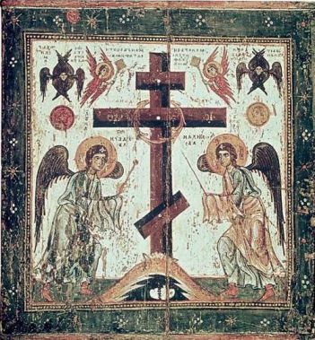 Двусторонняя икона «Спас Нерукотворный» с «Поклонением Кресту» на обороте (ГТГ) была создана, вероятно, для новгородской церкви Нерукотворного Образа около 1191 г. Изображения на обеих сторонах были написаны одновременно, о чем говорят технологические особенности, однако они демонстрируют разные грани интерпретации позднекомниновских традиций. Образ Спасителя на лицевой стороне (илл. 191) обладает плавными очертаниями, его лик смоделирован мягкими цветовыми сочетаниями, а плави создают постепенные и еле уловимые светотеневые переходы. Рисунок лика имеет чеканную точность и классичность, что, в контрасте с несколько аморфной и уплощенной карнацией, создает именно ту степень эмоциональности, в которой явственно узнается новгородский дух. При всей ясности и простоте форм, здесь нельзя не почувствовать того духовного напряжения, которое в отдельных проявлениях столь характерно для искусства позднего XII в. Композиция на оборотной стороне, где представлены два ангела, поклоняющиеся Кресту, выполнена в совершенно иной манере, где преобладает линия, графичность, светотеневые контрасты (илл. 192). В образах ангелов присутствует эмоциональная открытость, которая выдает не только иные стилистические приоритеты, но и упрощенное художественное мышление. Лик Спаса напоминает некоторые образы из церкви Св. Георгия в Ладоге, особенно пророков в барабане, тогда как ангелы с оборота скорее схожи с ангелами из «Страшного Суда» в той же церкви, автор которых, интерпретируя образцы ведущих мастеров, работает в более примитивной манере.