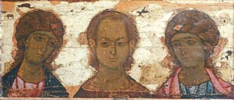 190. Явление Троицы Аврааму. Клеймо южных врат собора Рождества Богородицы в Суздале. Конец XII в.