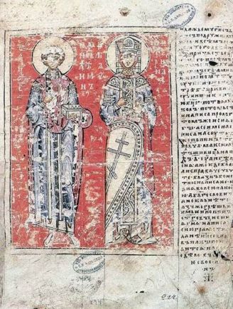 200. Свв. Пантелеимон и Екатерина. Миниатюра Пантелеимонова Евангелия. Рубеж XII–XIII вв. РНБ, Соф. 1