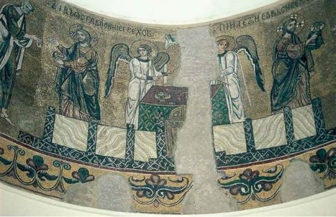 62. Христос и ангел из Евхаристии. Центральная часть композиции. Мозаика Михайловского Златоверхого собора в Киеве. Около 1112 г.