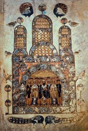 На илл. 3, 3 об., 128 и 128 об. помещены еще четыре миниатюры, одного и того же типа, с группами святителей и преподобных (илл. 71–74). Они являются не портретами авторов сочинений (лишь некоторые из изображенных принадлежат к числу авторов), а создают собирательный образ христианской книжной мудрости, основанной на сочинениях св. отцов. в центре миниатюры на л. 3 представлен Кирилл Александрийский в характерной для его иконографии шапочке (илл. 74), на л. 3 об. видны Василий Великий (или Григорий Богослов) и Иоанн Златоуст. Подобные групповые композиции известны в византийской миниатюре XI–XII вв. (Евангельские чтения в монастыре Дионисиат на Афоне, cod. 587 m, две рукописи Panoplia Dogmatica Евфимия Зигабена, Vat. gr. 666 и ГИМ, греч. 387). Все четыре миниатюры имеют большие орнаментированные рамы в виде храмов, которые заполнены роскошным «эмалевыми орнаментом и окружены райскими птицами. Такой тип обрамлений, символизирующий Премудрость, христианскую Церковь, окончательно сложился в византийском искусстве, видимо, именно в XI в. на основе позднеантичных и византийских арочных обрамлений и раннесредневековых изображений Гроба Господня в Иерусалиме и храма Воскресения. В византийском искусстве обрамления в виде храмов сохранились лишь от XII в., тогда как русские памятники позволяют судить о ранней фазе их развития.