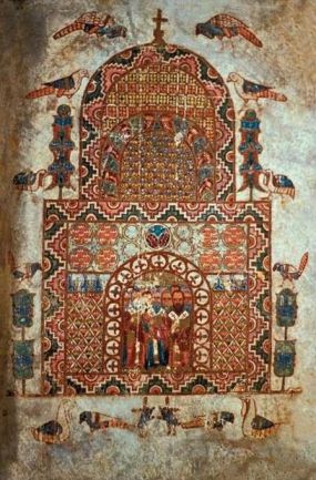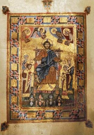 79. Христос на троне, коронующий князя Ярополка и его жену Ирину. Миниатюра Молитвенника Гертруды. 1078–1086 гг. Чивидале, Национальный археологический музей, cod. CXXXVI