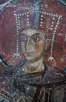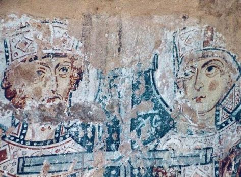 81. Константин и Елена. Роспись Мартириевской паперти Софии Новгородской. Последняя четверть XI в.