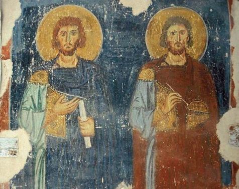90. Св. Флор и Лавр. Фреска южного предалтарного столба собора Рождества Богородицы Антониева монастыря в Новгороде. 1125 г.