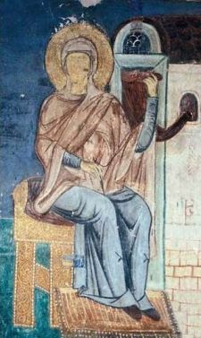 Иную сторону этого утонченного искусства демонстрирует нам «Благовещение», где, к сожалению, сама живопись сохранилась довольно плохо, но хорошо читаются все иконографические подробности изображения. Главной особенностью этой фрески являются различные детали, окружающие фигуру сидящей за пряжей Богоматери: расположенные за ее спиной город и стена, выглядывающий из-за нее сад, а также сама поза Богоматери, которая, сидя на престоле, обернулась к явившемуся ей архангелу, и смиренно приемлет явившуюся благодать, что показано через жест ее рук, выражающих и внутренний трепет, и покорность высшей судьбе (илл. 68). Указанные детали появляются не ради усложнения композиционного строя, но отражают новые тенденции в византийском искусстве раннего XII в., когда в нем стали появляться мотивы, иллюстрирующие тот или иной богослужебный текст. В данном случае изображения города, стены и огражденного сада могут быть связаны с эпитетами Богоматери, которые мы встречаем в Акафисте Богоматери: «Радуйся, Владычице, одушевленный раю, древо посреде имея жизни Господа», «граде всех Царя», «цвет неувядаемый», «вертоград Господень», «покров и держава, стена и утверждение», и, наконец, «царствия нерушимая стена».