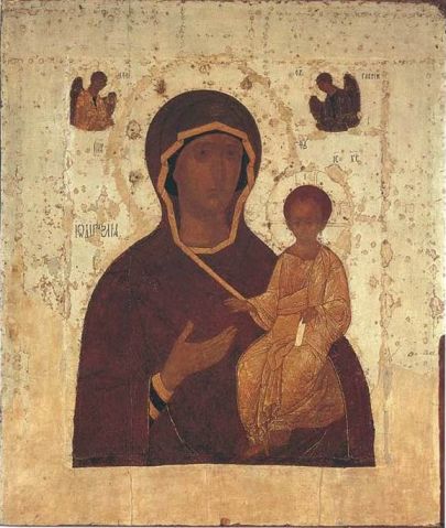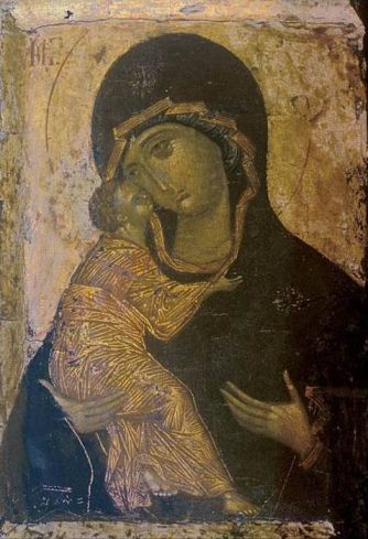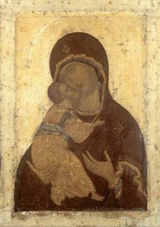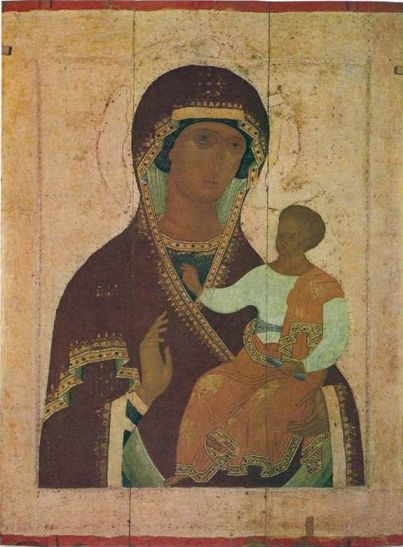 415. Андрей Рублев. Богоматерь Владимирская. Около 1408 г. Из Успенского собора во Владимире. Владимиро-Суздальский музей-заповедник