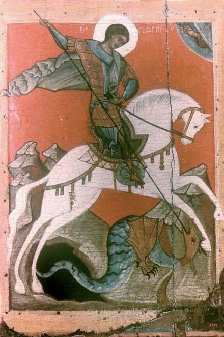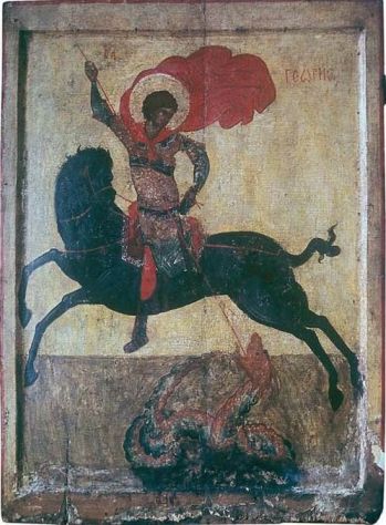 По динамической основе композиции, обилию византийских мотивов, пафосу героического подвига к храмовому образу Архангельского собора близка икона «Чудо Георгия о змие», найденная в одном из сел на реке Пинеге в Архангельской области (Лондон, Британский музей; илл. 397). Элементы композиции, особенно изображение черного (что относительно редко в сценах со св. Георгием) коня, прописаны так тонко, как это бывает скорее в византийской, а не в русской иконописи. Но исключительной красоты силуэт, какой-то неземной полет всадника, да и сам сюжет, нехарактерный для византийской иконописи, указывают на принадлежность иконы к русской, скорее всего московской культуре. Атрибуция подкрепляется и сходством побежденного дракона с изображениями змей в московских рукописях рубежа XIV–XV вв., особенно в Евангелии Хитрово.
