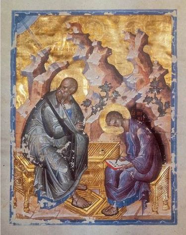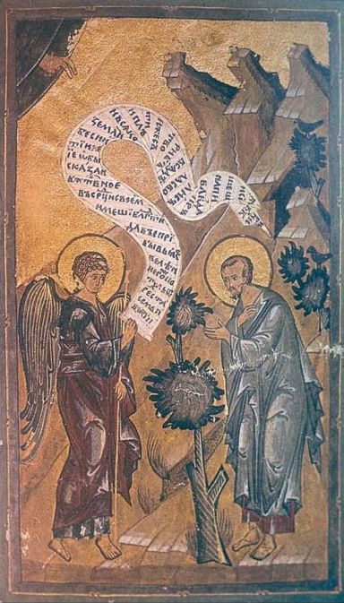 В отличие от миниатюр Рогожского Евангелия, с их по-иконному яркой и фактурной живописью, в Евангелии апракос графини Шереметьевой (ГИМ, Син. 364) эмоциональность выражена прозрачностью живописи, голубыми рефлексами символического небесного света, стремительными диагональными линиями и вдохновенным выражением на тонких большелобых ликах. Лучшая из четырех миниатюр изображает Иоанна Богослова, среди скал, около пещеры на острове Патмос, взволнованно вслушивающегося в небесный глас и обернувшегося к небесному лучу (илл. 524). Подняв руку, в движении и сложном ракурсе, он словно стремится вобрать благодать в открытую ладонь, а через другую руку, положенную на голову Прохора, передать ему смысл откровения.